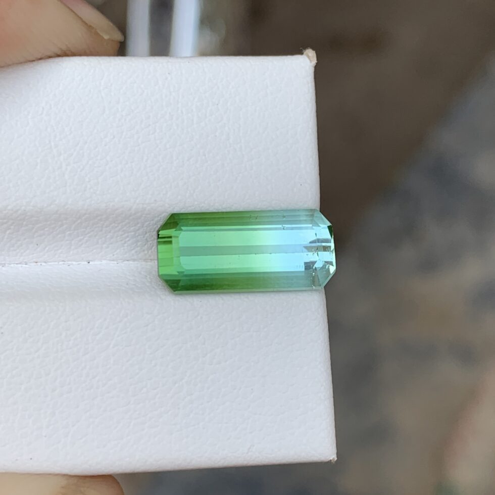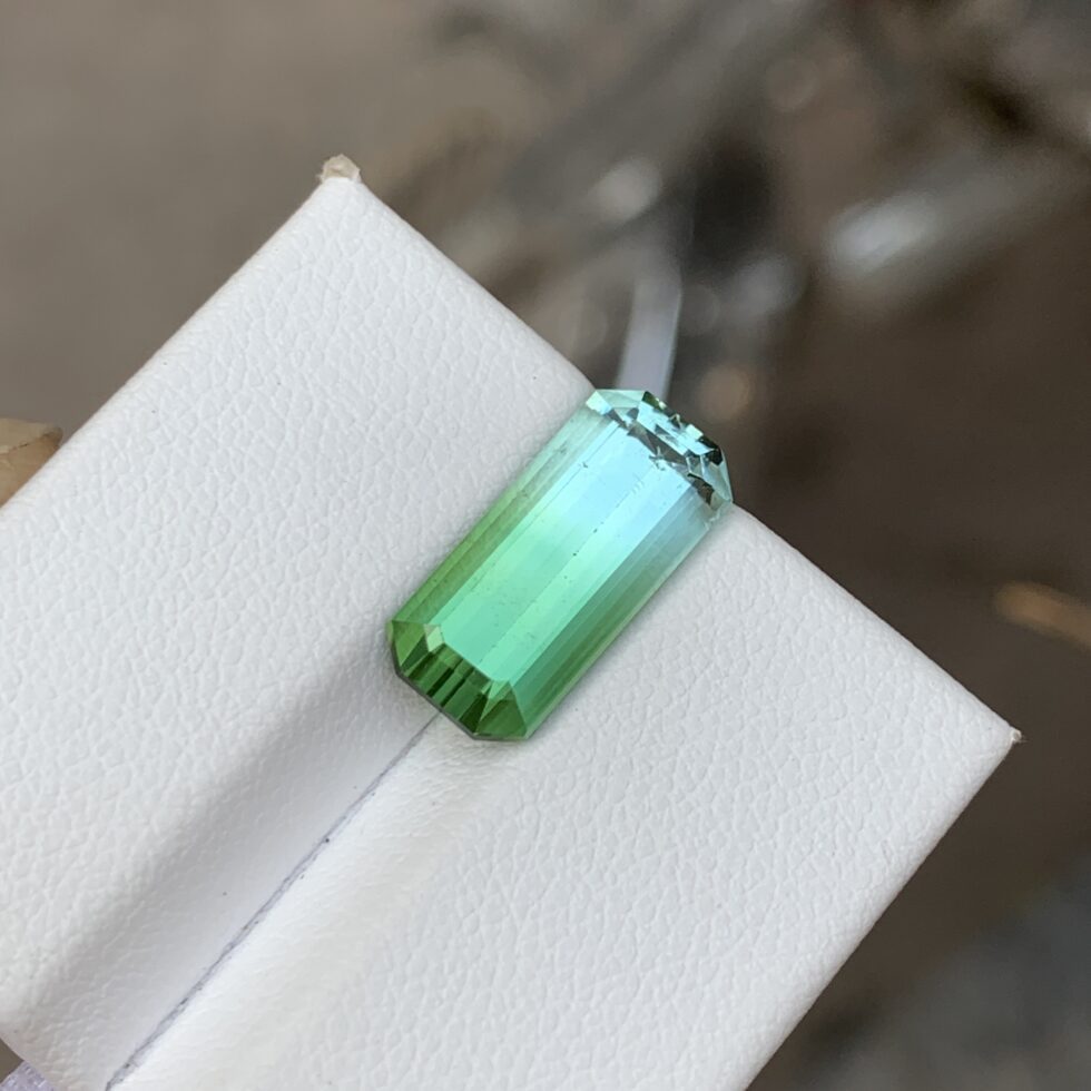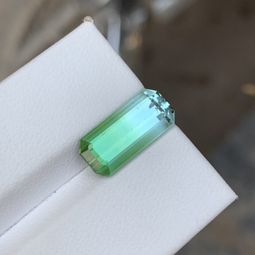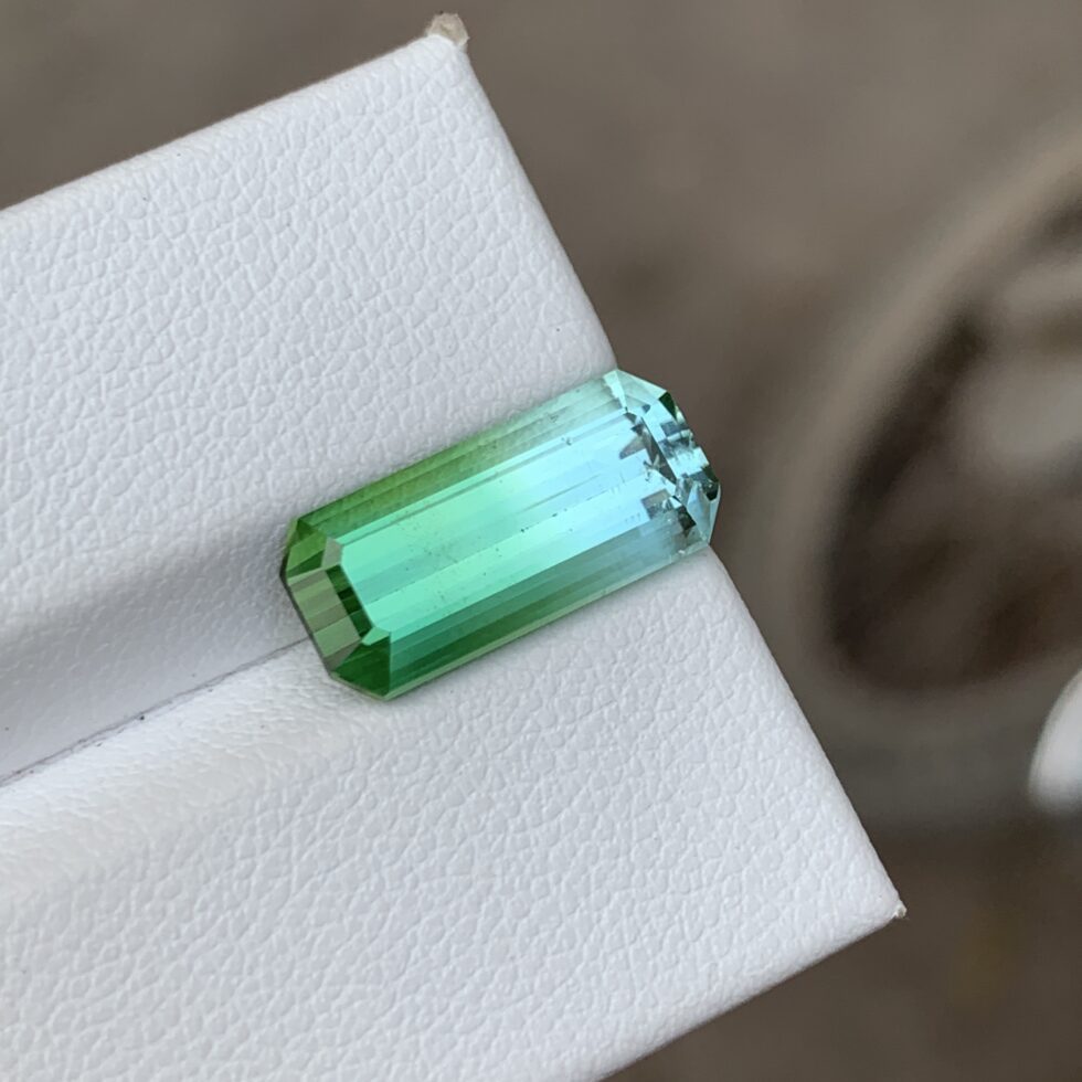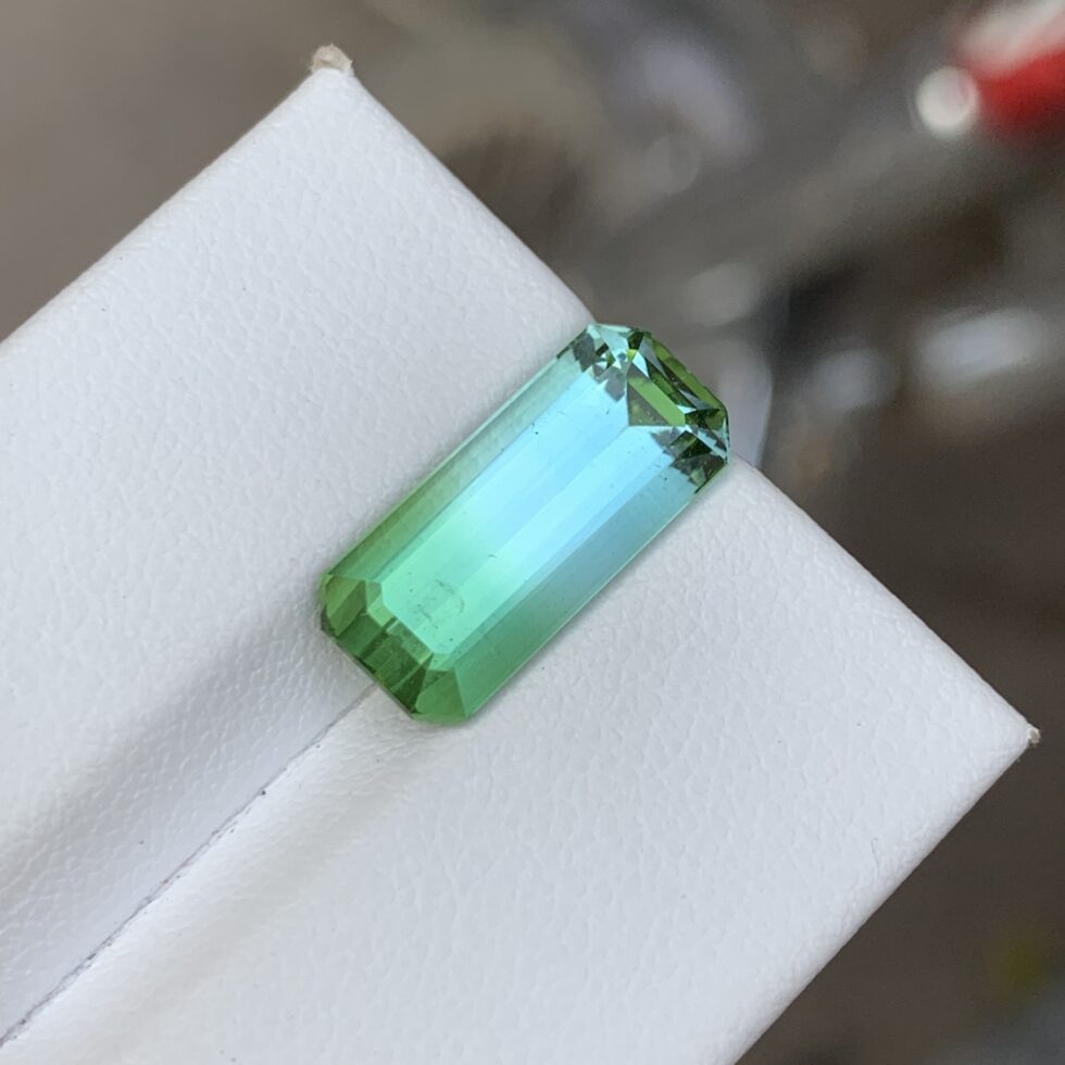An expertly emerald-cut bicolor tourmaline showcasing striking natural color transitions, crisp step facets, and clean geometric lines. Distinct dual hues and refined symmetry enhance depth and clarity, offering timeless elegance with a modern, sophisticated edge.