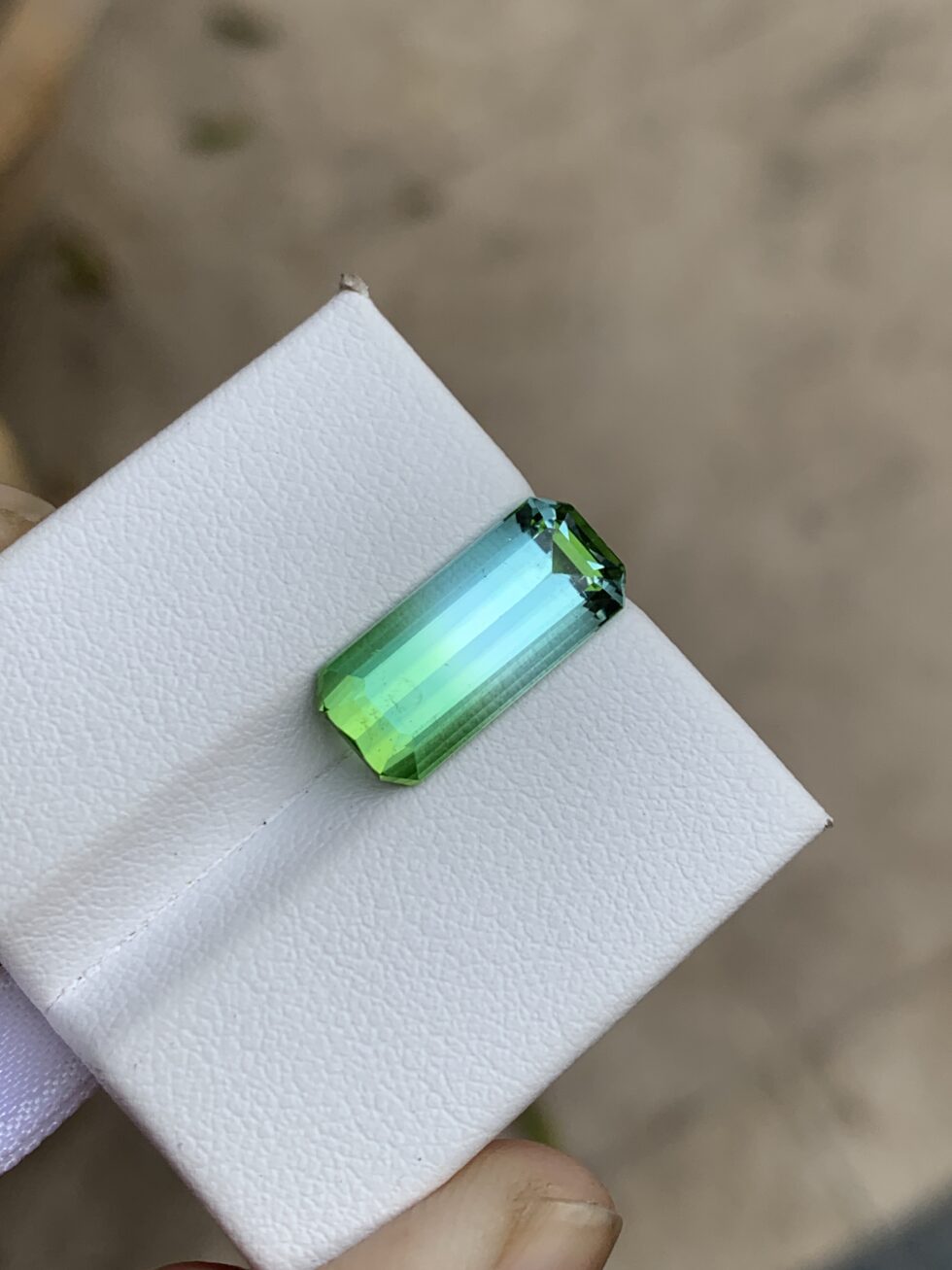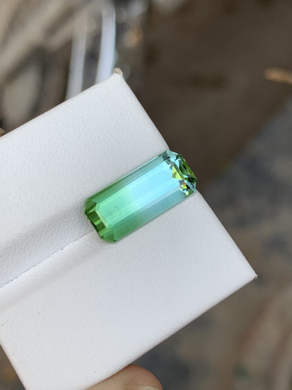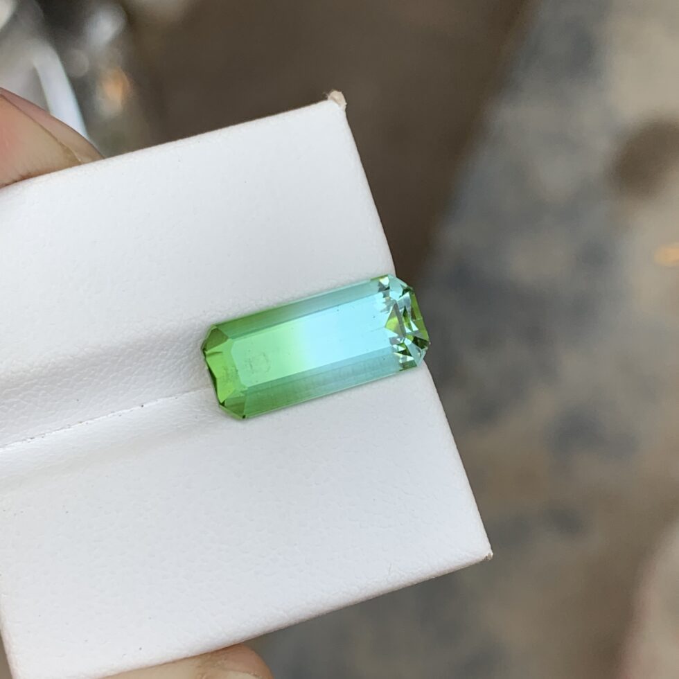 An expertly emerald-cut bicolor tourmaline showcasing striking natural color transitions, crisp step facets, and clean geometric lines. Distinct dual hues and refined symmetry enhance depth and clarity, offering timeless elegance with a modern, sophisticated edge.