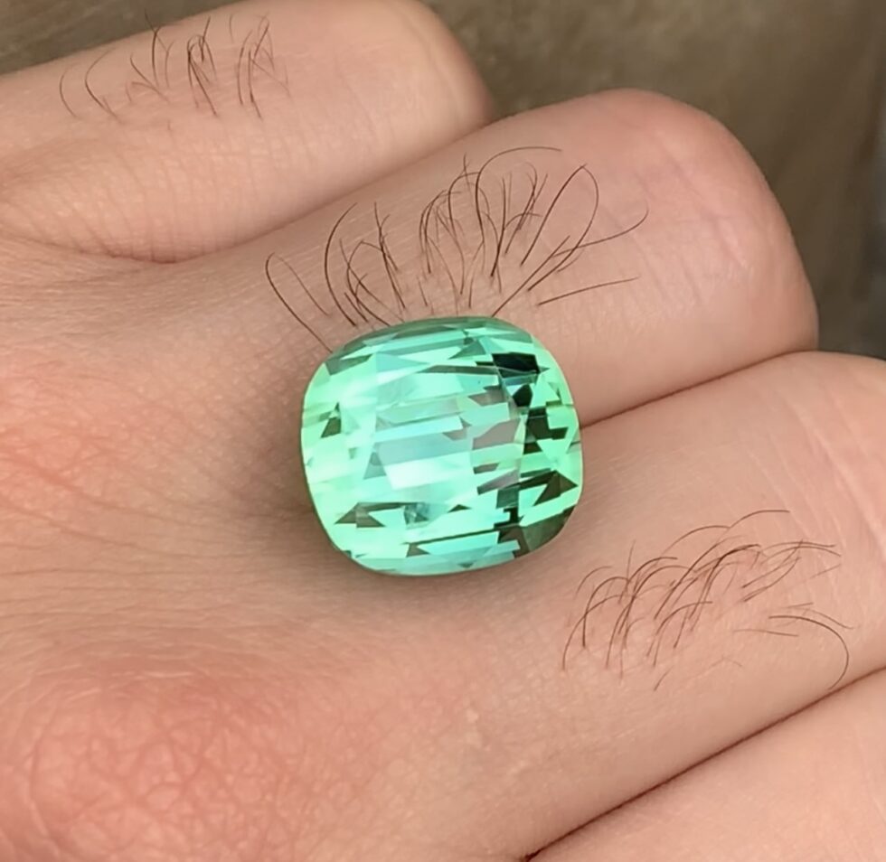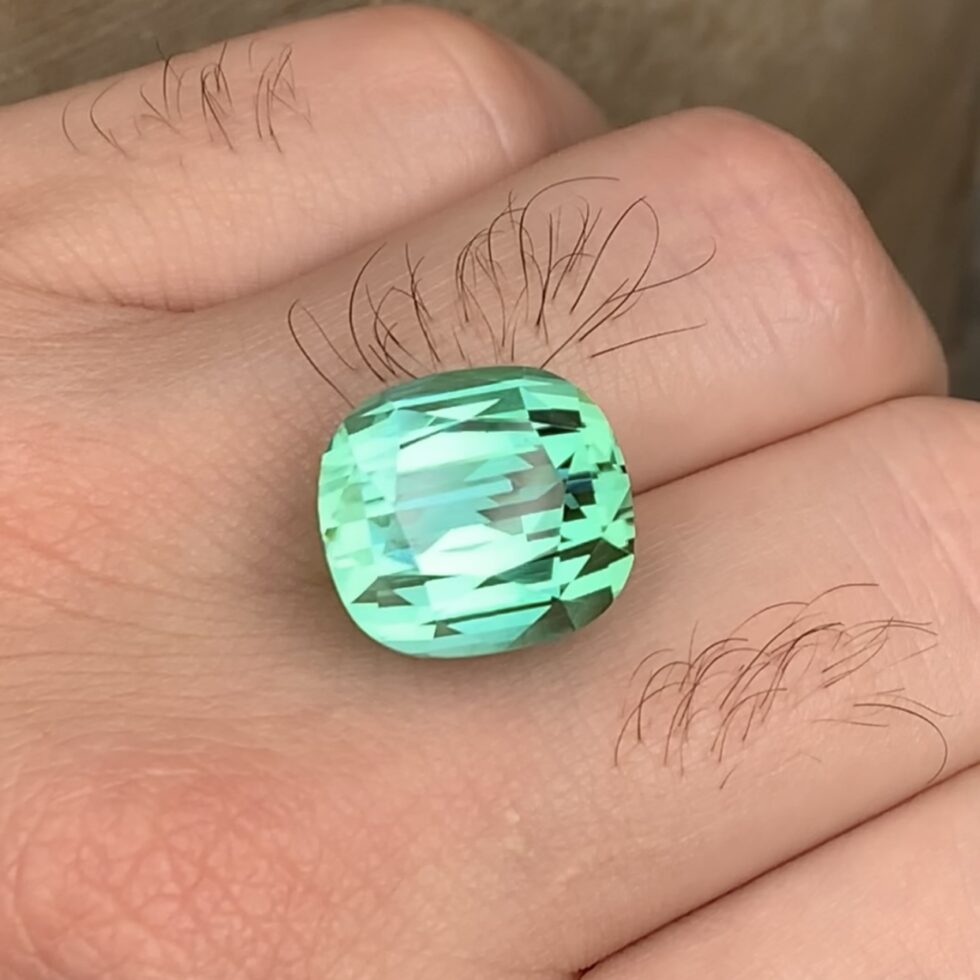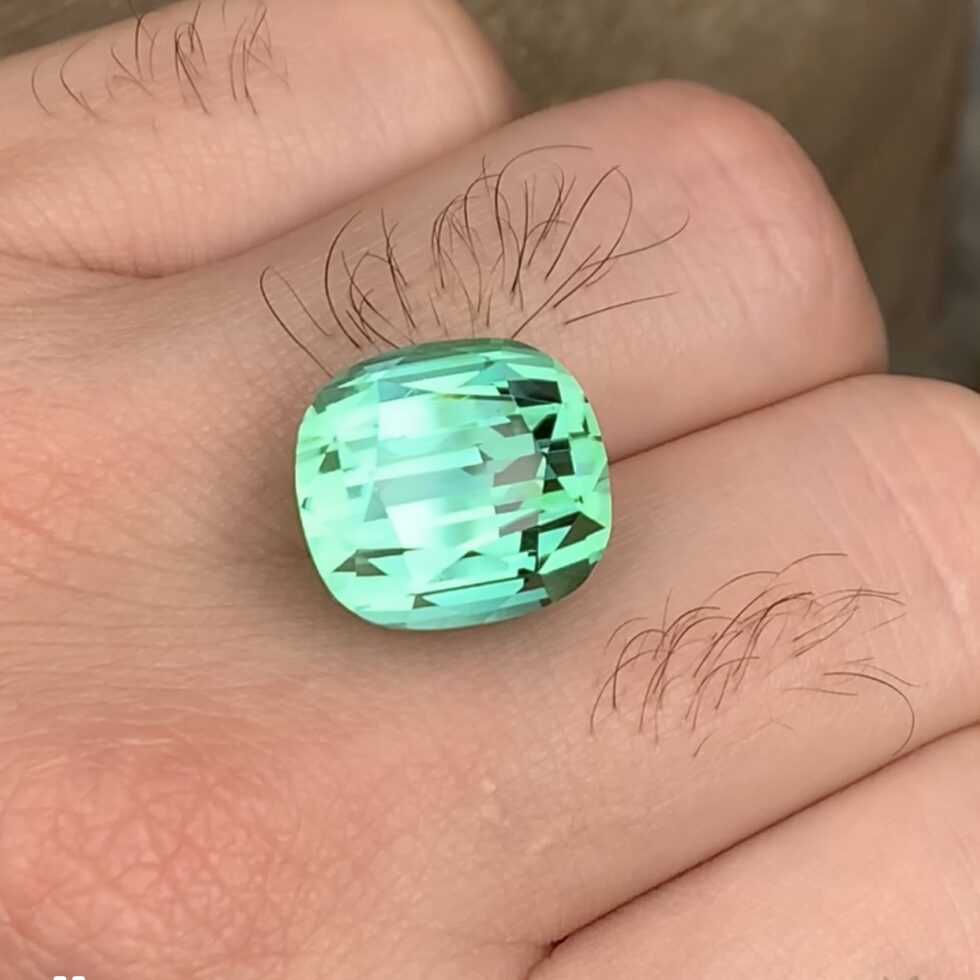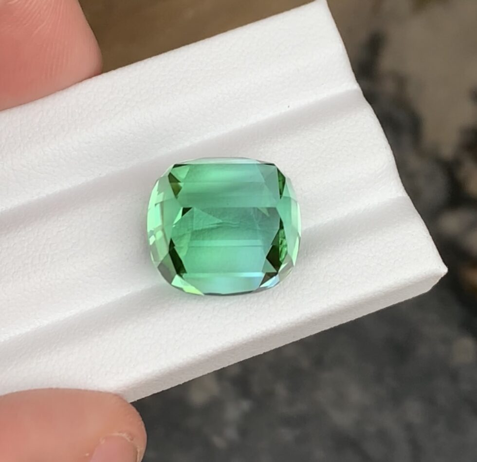 Add a touch of elegance to your collection with this Mint Green with Blue Shade cushion-cut natural tourmaline. Featuring a rich, vibrant hue and expertly faceted in a classic cushion shape, this gemstone captures and reflects light beautifully from every angle. Mined from natural sources and untreated, its earthy green tones make it an ideal centerpiece for both vintage and modern jewelry styles.